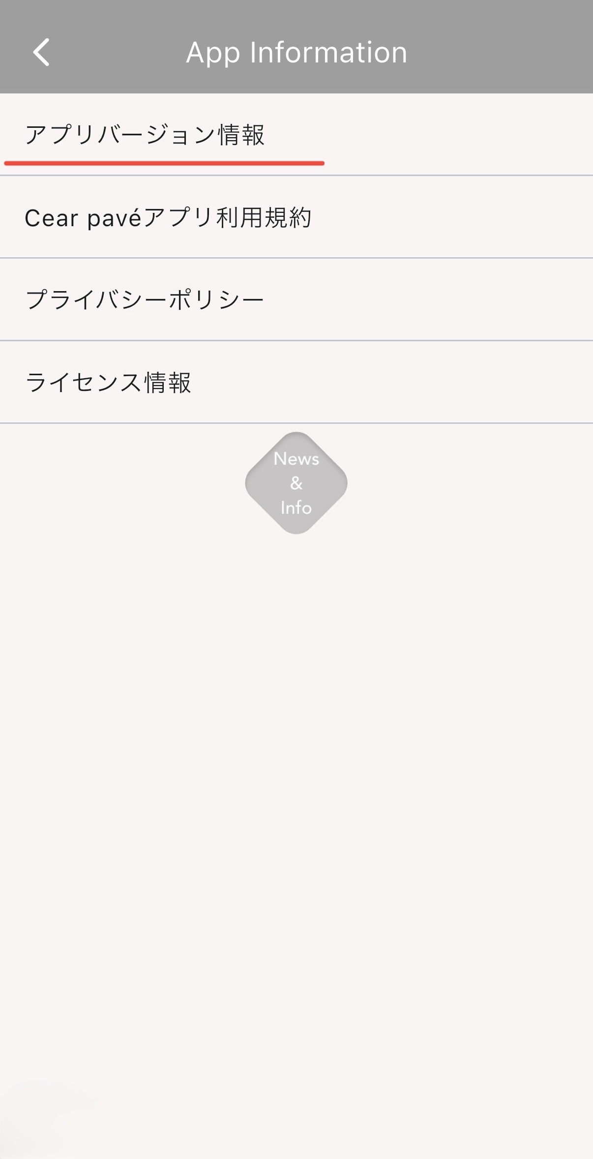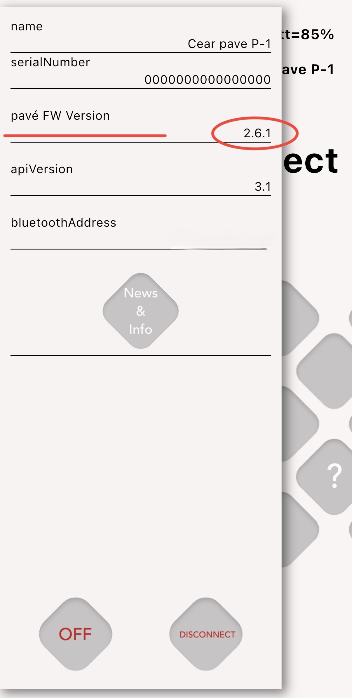 ※アップデート完了後のファームウェアVer.確認方法は、アプリホーム画面左上の歯車マークをタップし、pavé FW Version で確認が出来ます。