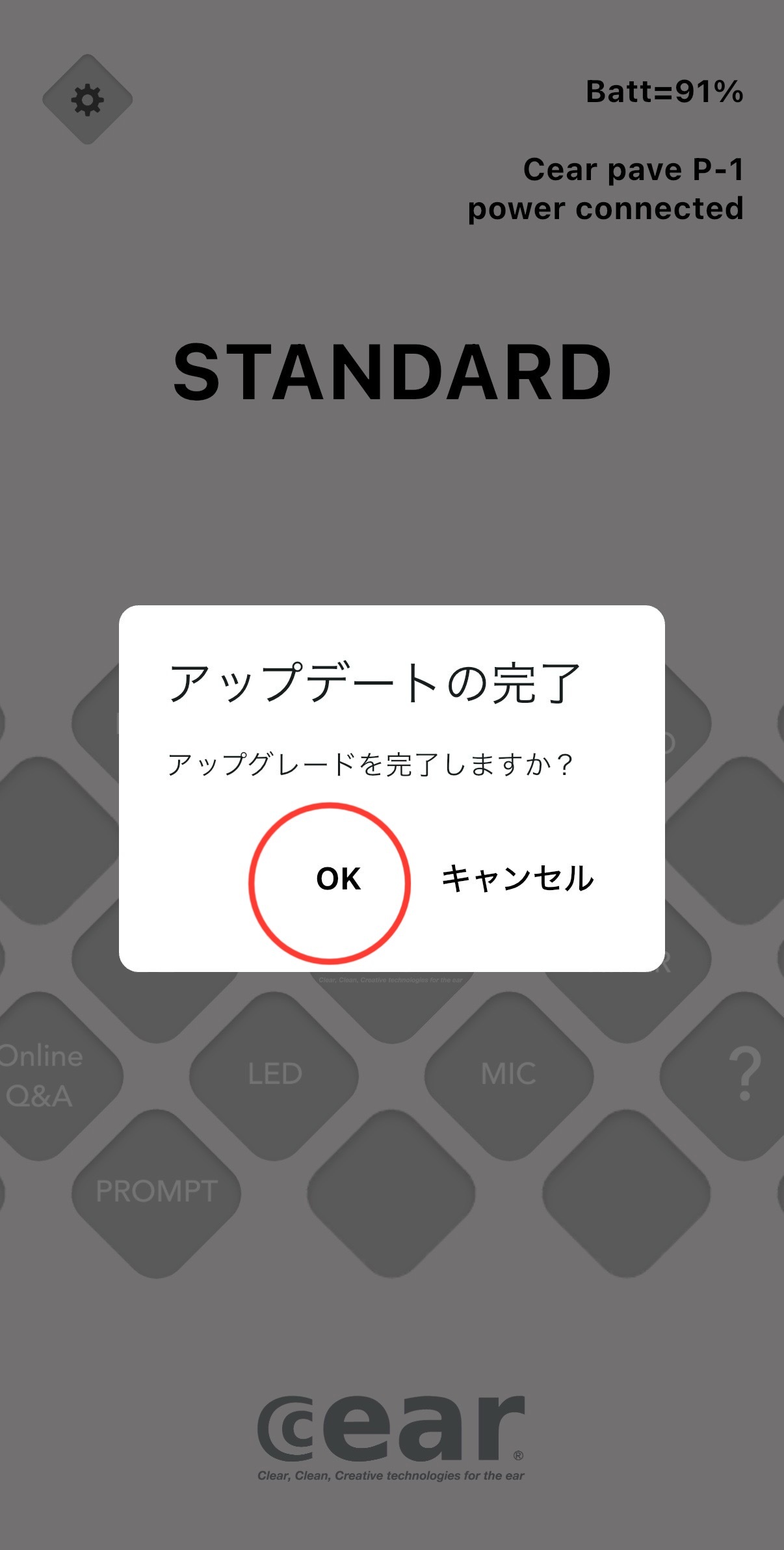 5,シーイヤーパヴェが自動で再起動し、「アップデート完了」の表示が出たら「OK」をタップして完了です。
